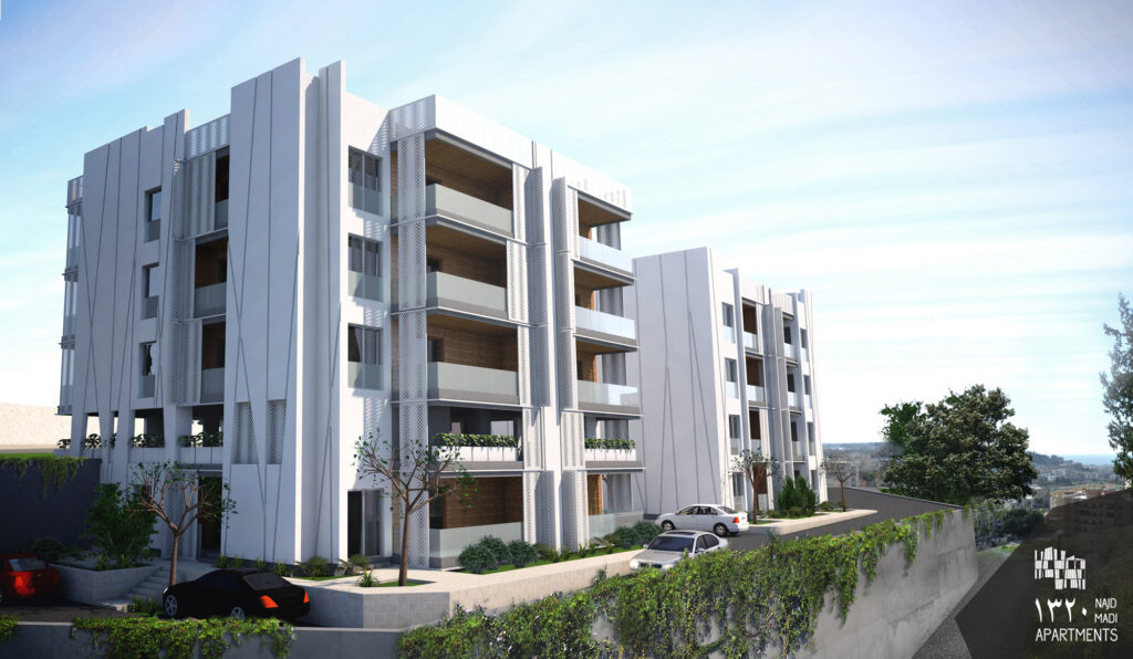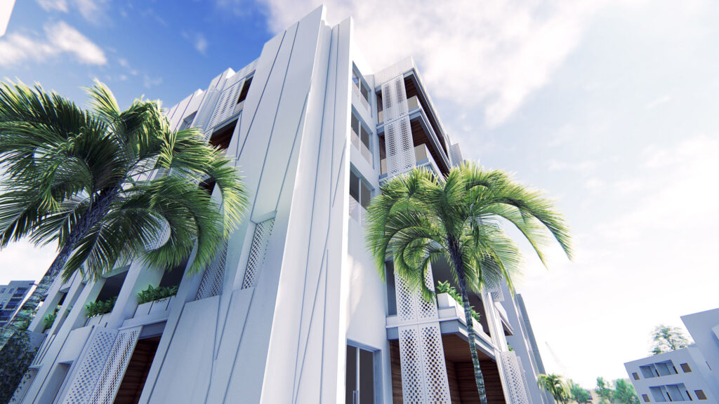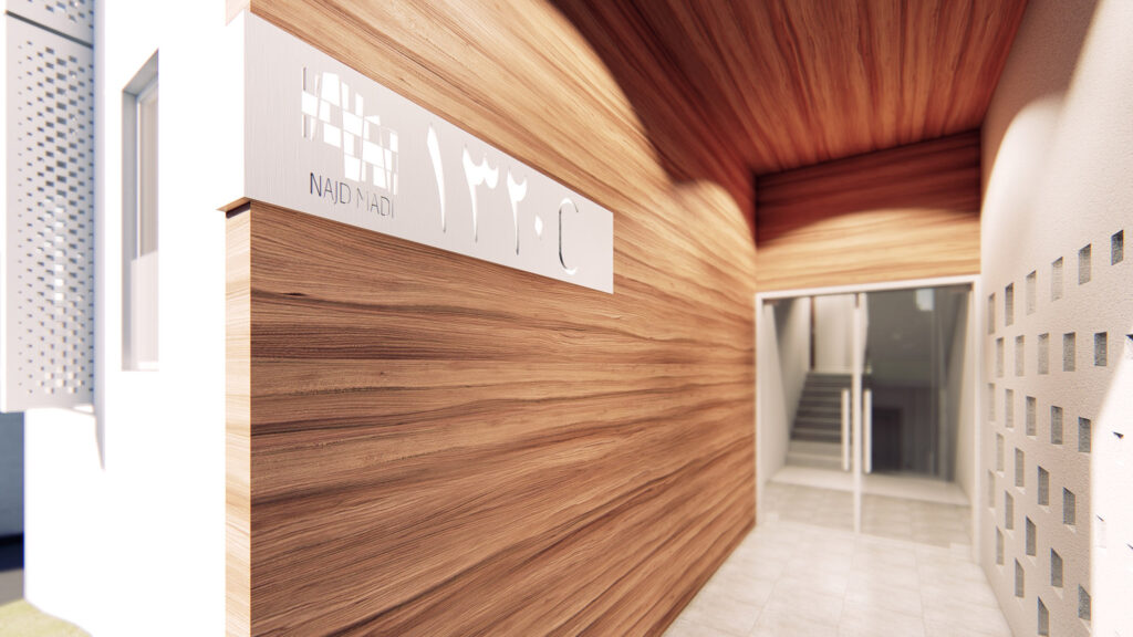 A layered façade system defines the visual character of the project. Perforated screens modulate sunlight, reduce glare, and provide privacy while allowing the interiors to remain luminous and breathable throughout the day. Their geometric patterns, together with the vertical lines carved into the envelope, establish a dialogue with the adjacent Najd Madi HQ—extending its language rather than competing with it.