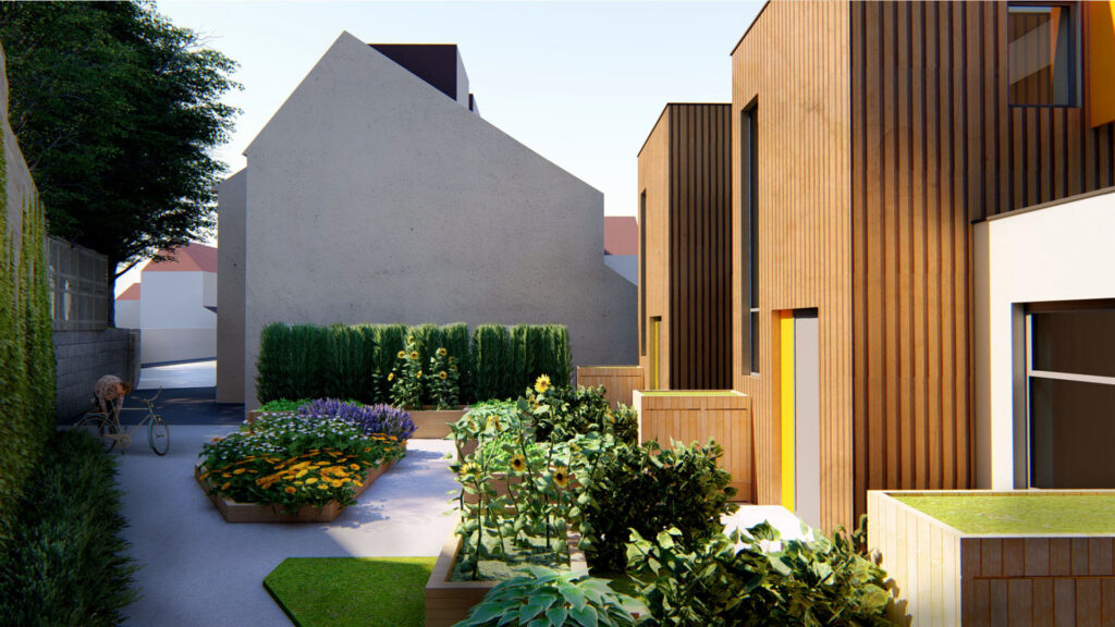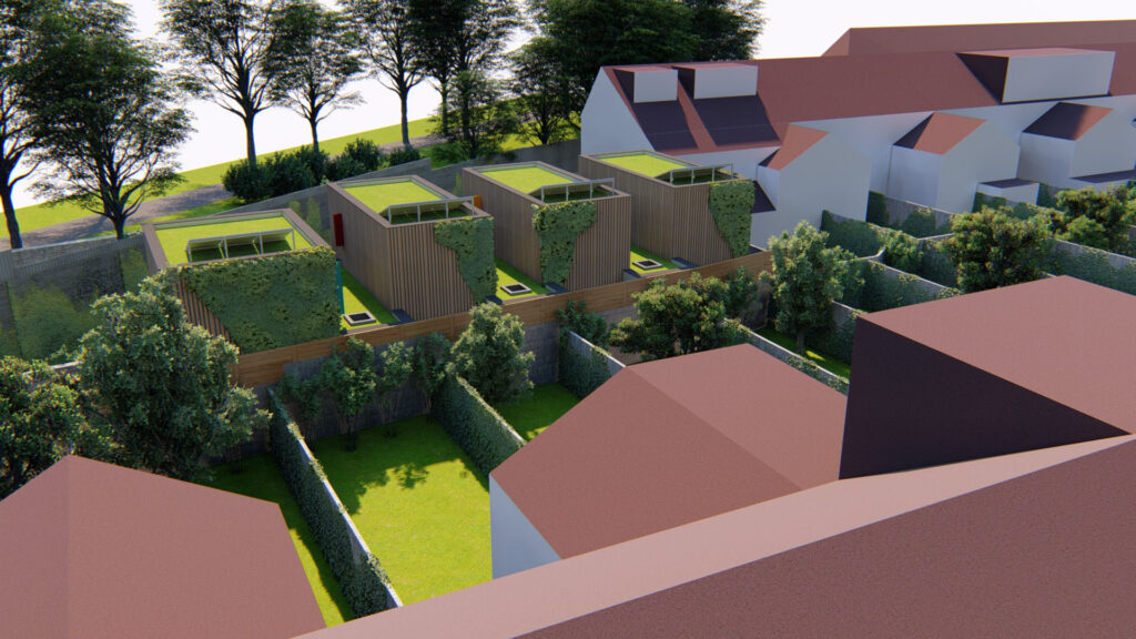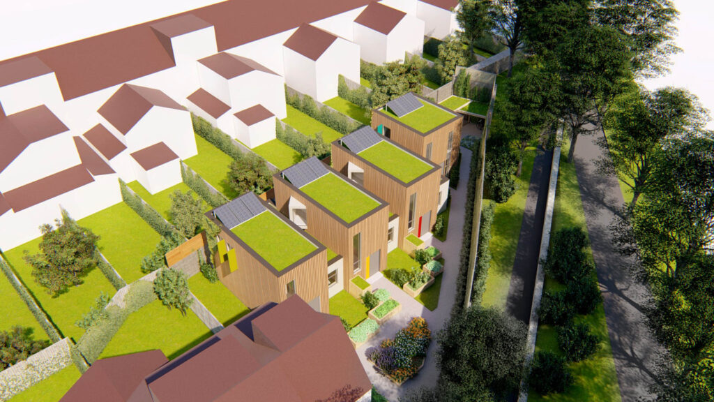 The proposal reimagines an underused urban side plot within one of Bristol’s densest residential neighbourhoods. The site—a large, overlooked side garden with no direct street frontage—sits quietly behind a row of two-bedroom terraced houses, bounded along its edge by the Bristol–Bath Railway Cycle Path. This condition, both constrained and strategically located, became the project’s primary driver.