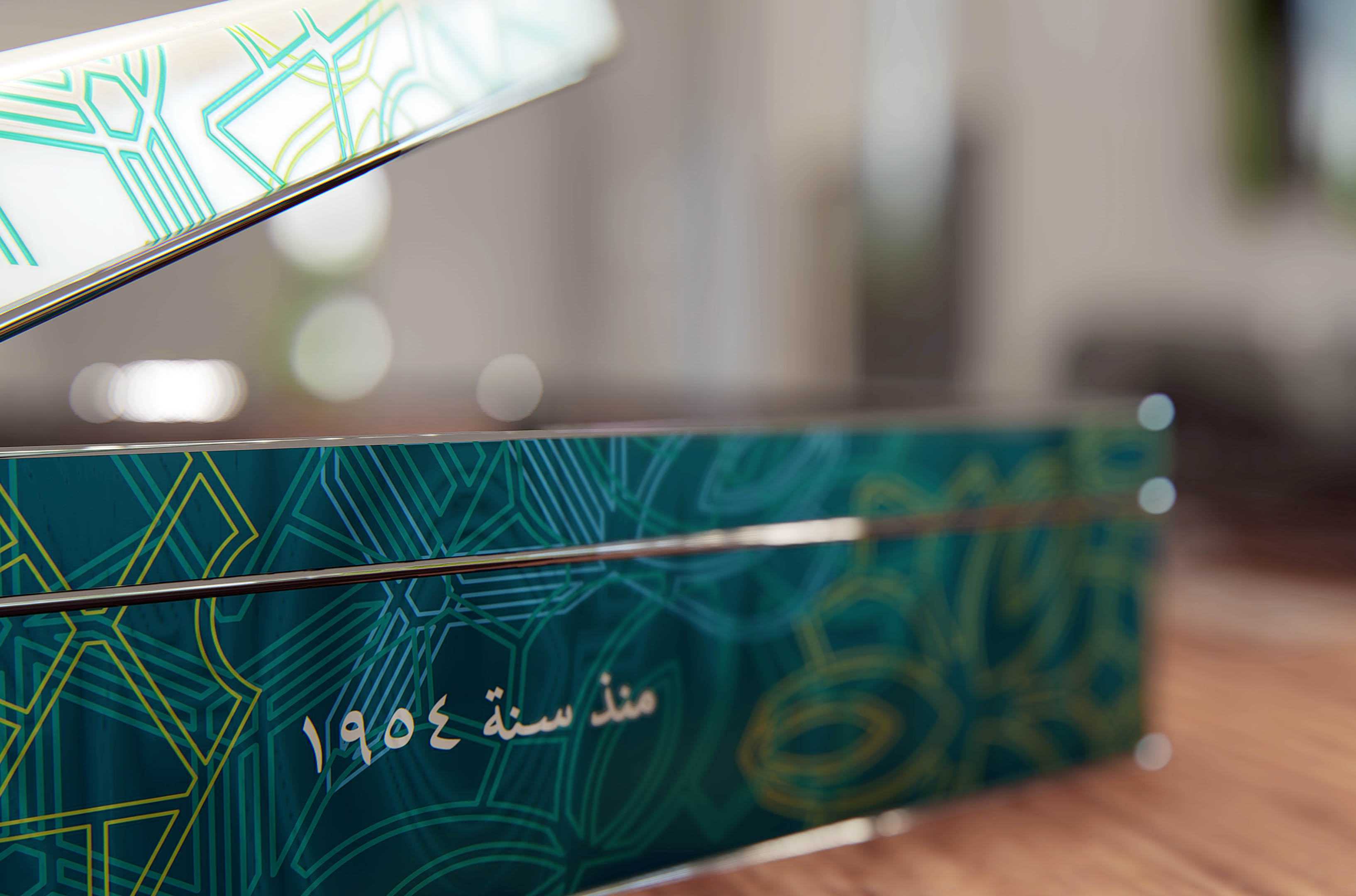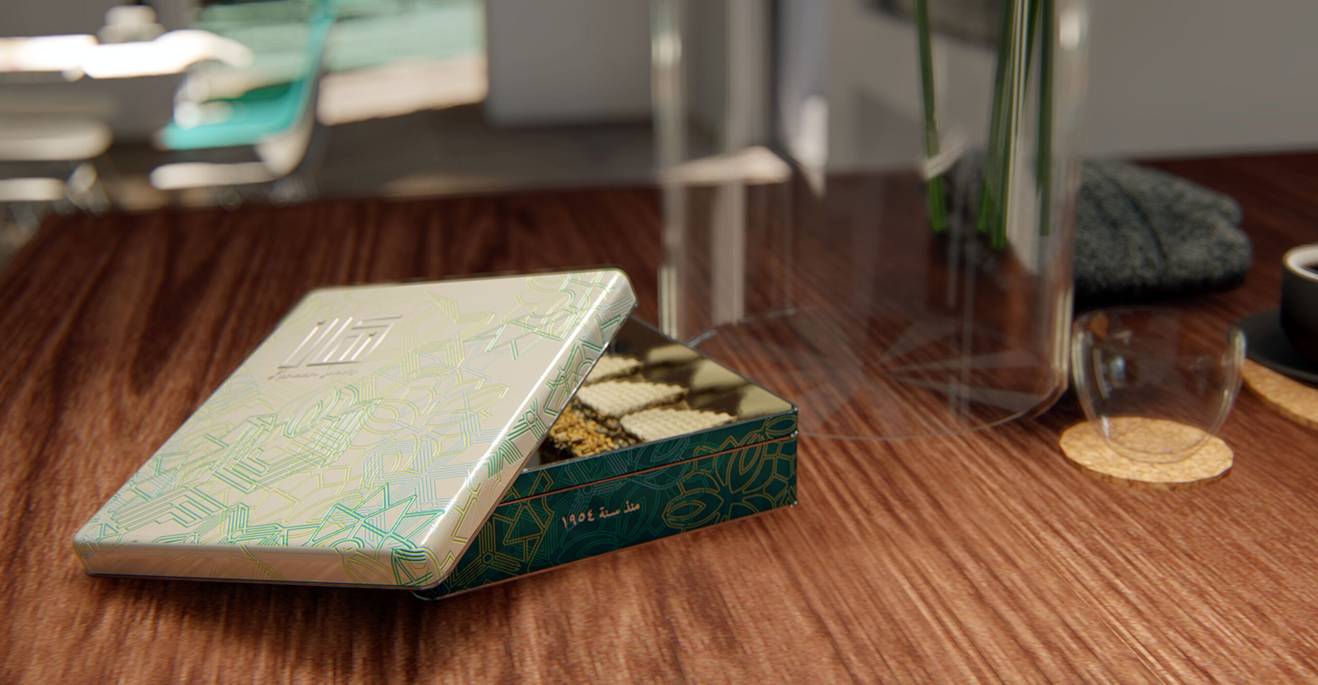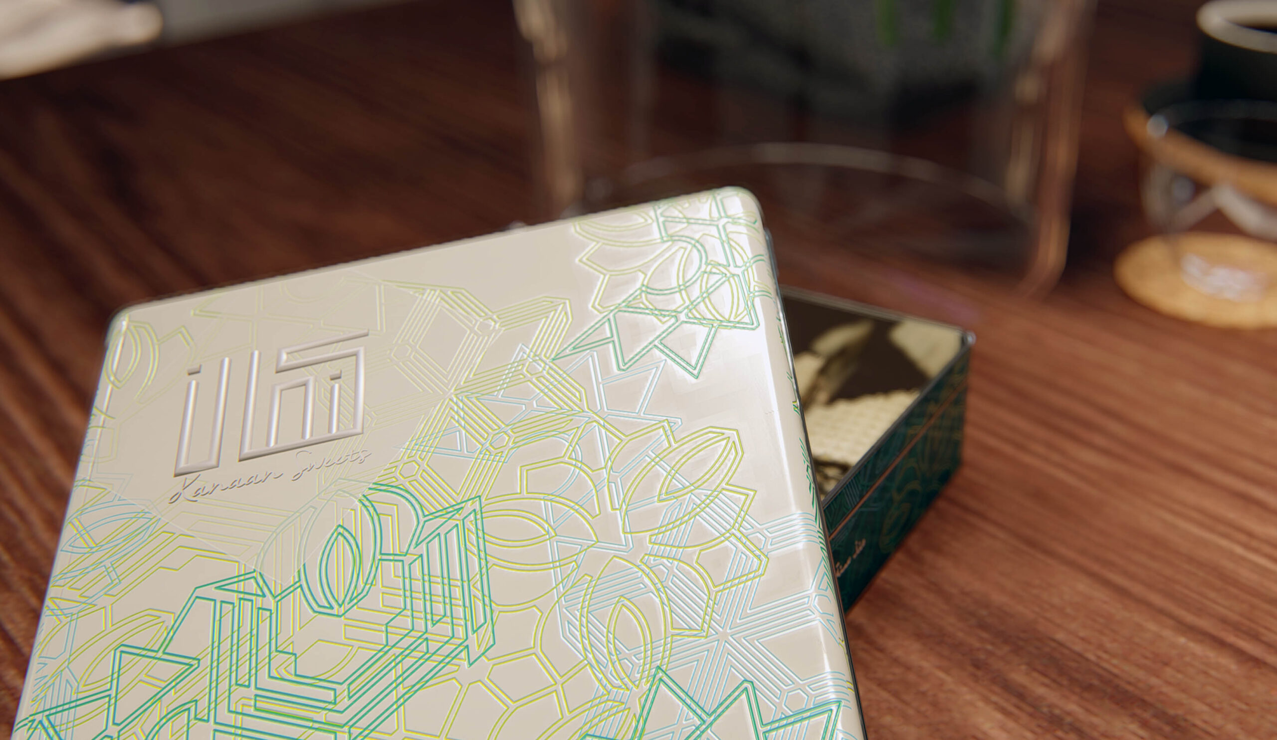 The tin design is inspired by the patterns of traditional wooden pastry moulds, such as those used for maamoul, alongside the geometric textures found in a variety of Arabic sweets and pastries.