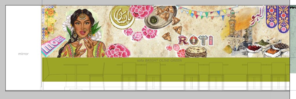 Nossh Grill is an interior project for a Pakistani street-food restaurant in Easton, Bristol. The brief was to create an immersive environment that reflects the energy, colour, and informality of Desi street culture, while working within the practical demands of a compact hospitality space.