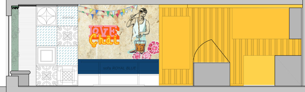 The design draws from the visual language of South Asian street life, translating it into a layered interior rather than a themed set. Bold colour is used unapologetically, combined with a mix of robust, everyday materials including bright yellow corrugated metal sheets, decorative tin tiles, mirrored surfaces, and painted finishes across walls and ceilings.