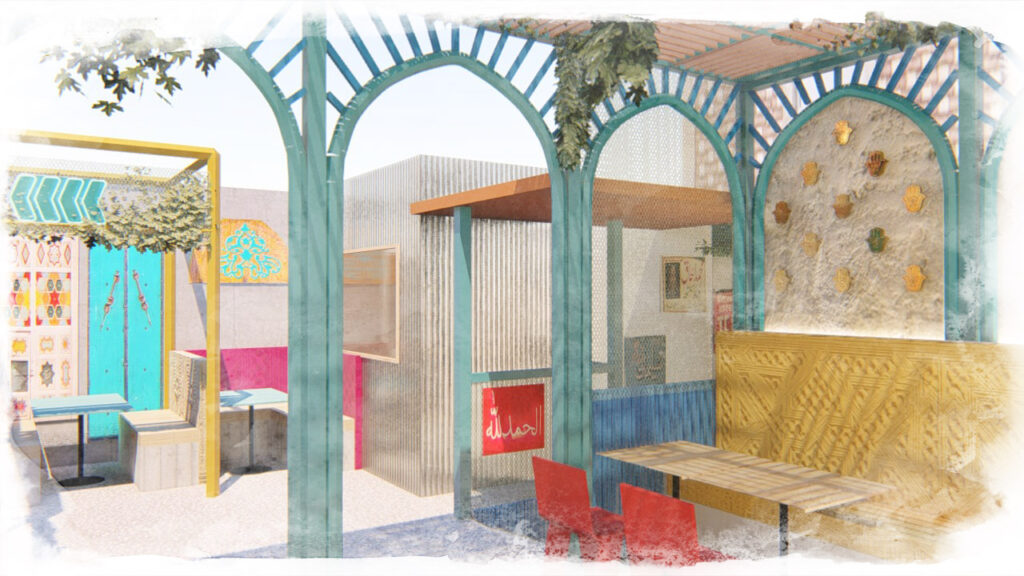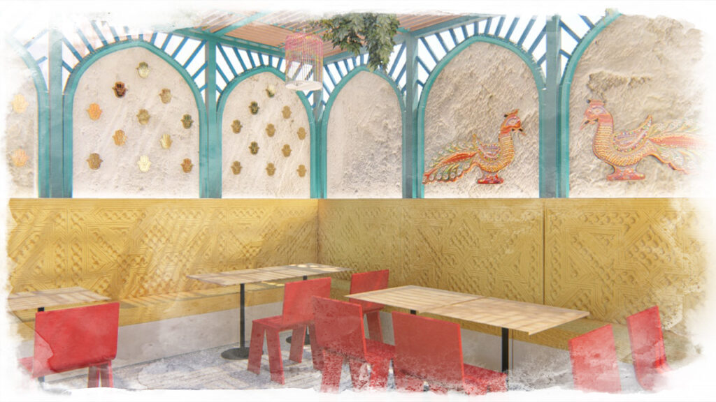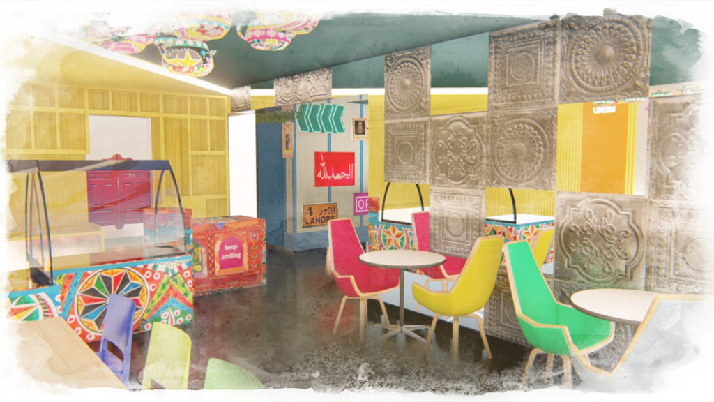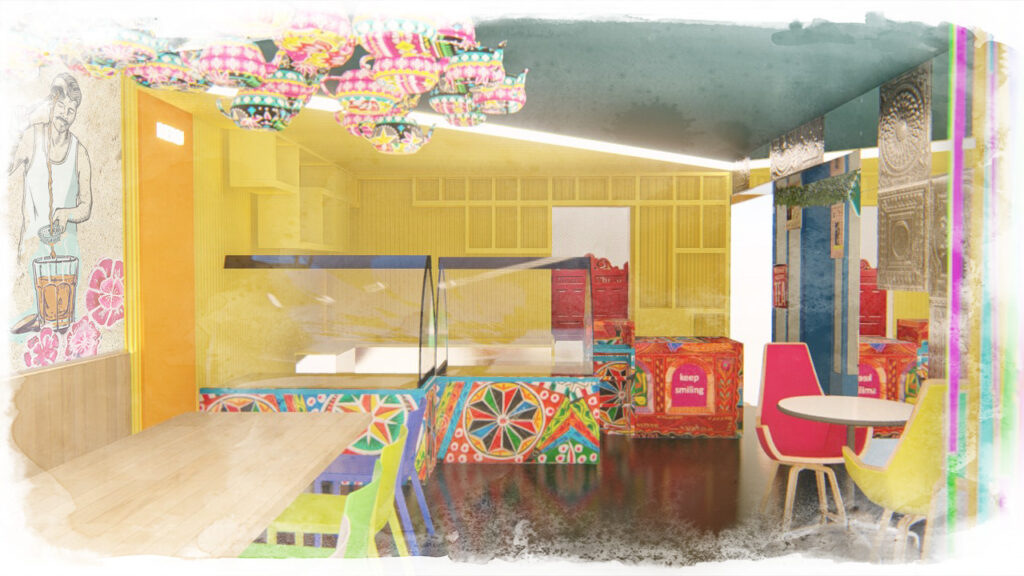 Hand-painted kettles suspended overhead and large-scale murals depicting scenes of street life introduce movement, texture, and narrative into the space. These elements work together to create a lively, informal atmosphere that feels animated and dense, echoing the sensory richness of food streets in cities such as Lahore and Karachi.