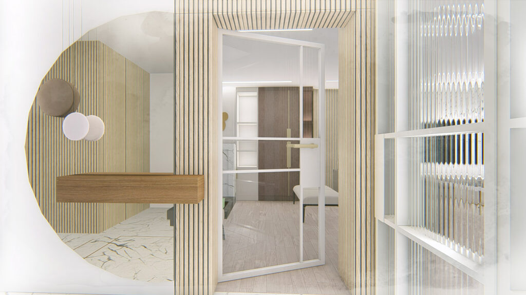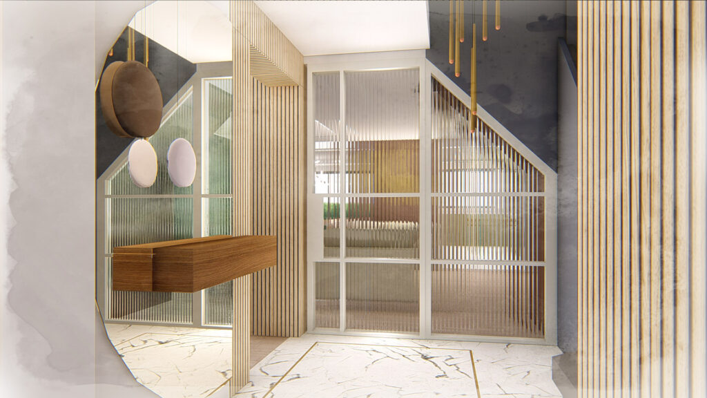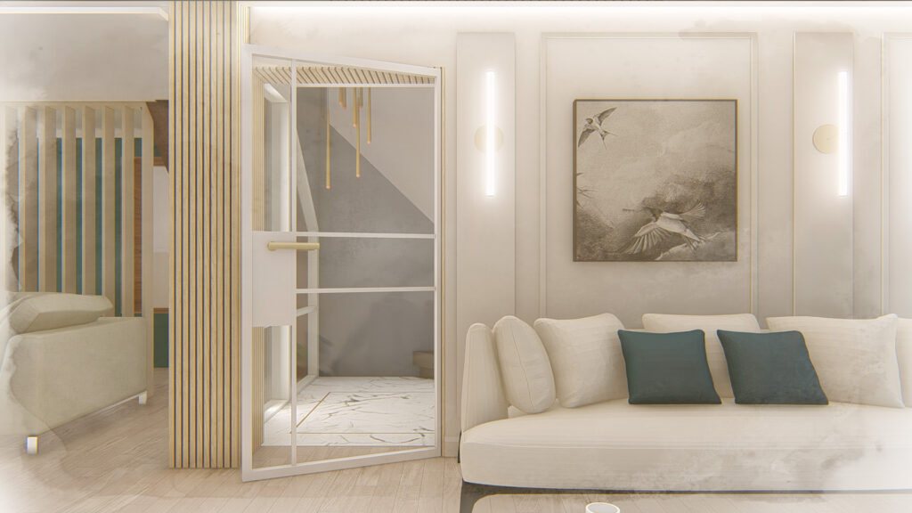 A natural, muted colour palette with subtle accents enhances the home’s sense of light and spaciousness, complementing its original 1930s character while introducing a contemporary, luxurious feel. The entrance zone is carefully defined to guide movement, offering alternative flows toward the living areas, kitchen, and utility spaces.
