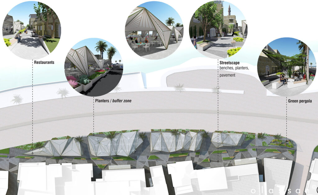 Rather than functioning as isolated objects, the structures act as spatial instruments: filtering views, framing proximity to the sea, and organising a sequence of shaded, porous environments that encourage engagement without enclosing the waterfront.