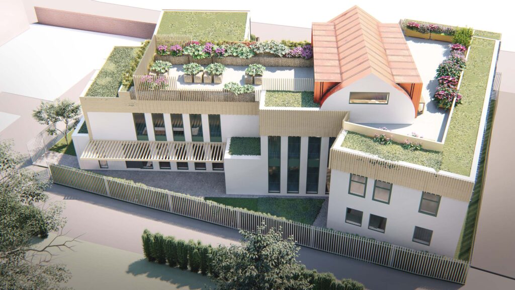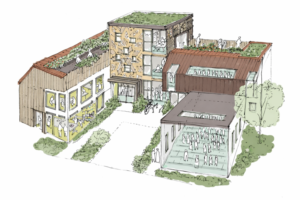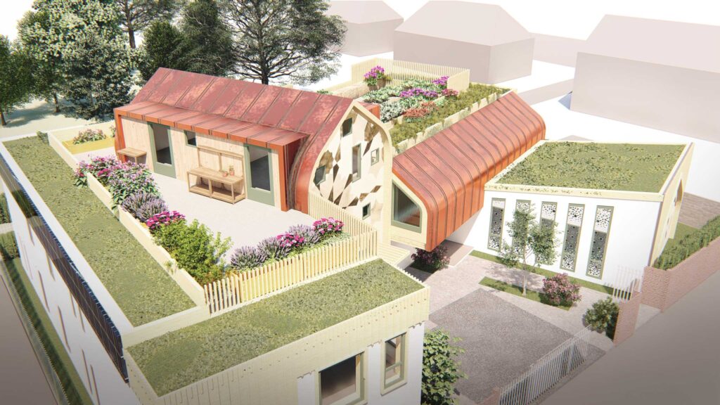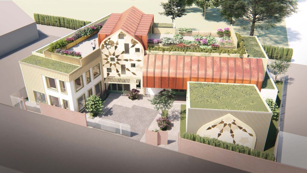The adjacent allotments became a key reference for the project—both spatially and socially. Like the Islamic centre, they are places shaped by collective use, care, and shared responsibility. This relationship informed the building’s approach to landscape and sustainability: green roofs, a ground-floor garden connected to the communal kitchen, rooftop terrace allotments, and integrated habitats for birds and insects extend community activity into the fabric of the building while supporting local biodiversity.