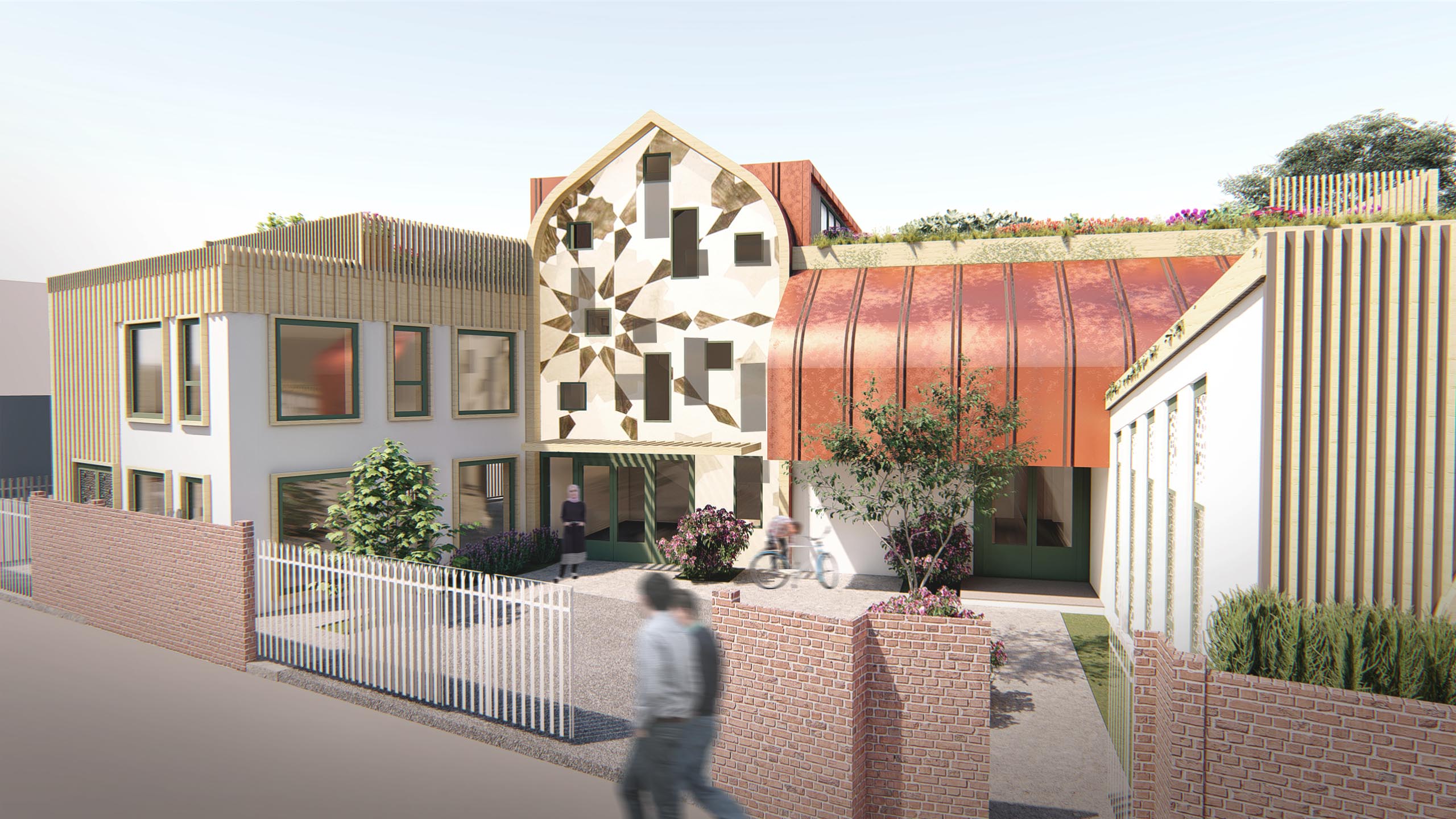 The proposal is organised as a series of interlocking volumes arranged around a semi-enclosed courtyard facing the access lane. This spatial strategy establishes a clear address and a calm arrival sequence, mediating between the openness of the surrounding allotments and the internal life of the centre. Prayer spaces for men and women are clearly organised with dedicated access and supporting facilities, while remaining connected to shared community spaces that activate the building throughout the day.