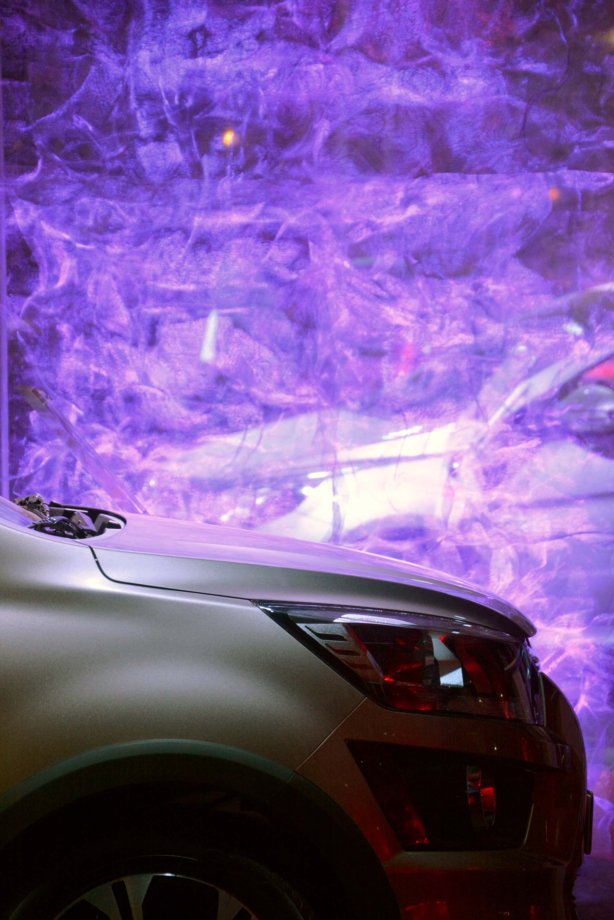 A multi-angled platform was constructed using the existing truss system, forming a layered scenography that framed the displayed cars while maintaining visual permeability. The structure was wrapped in stretched metal mesh, creating semi-transparent spatial divisions that softened the scale of the installation and allowed light to diffuse across surfaces.