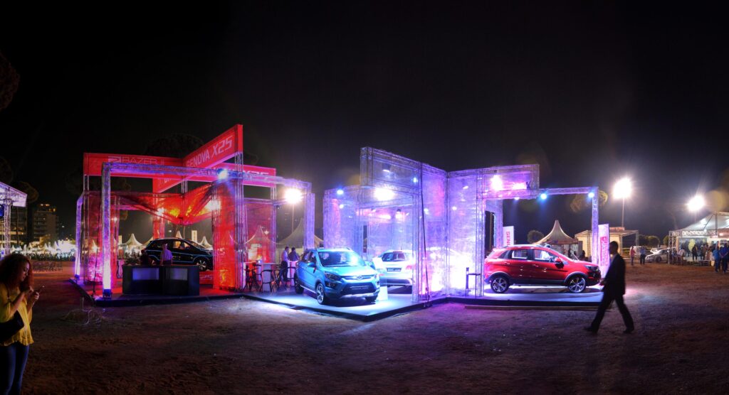 This project was commissioned as an outdoor event-space installation for the launch of BAIC cars during Vinifest 2016, a large-scale public festival held at the Beirut Hippodrome. Positioned at the centre of the event, the installation was required to present the vehicles clearly while remaining legible and engaging from all sides.